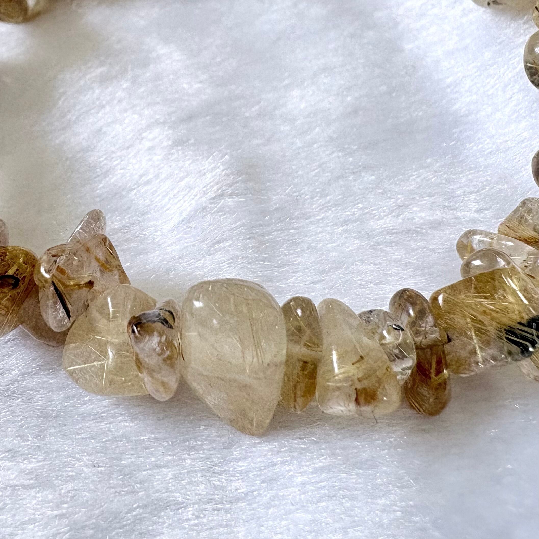 美しい金色の針状結晶が特徴のタイタンルチルを使用したさざれブレスレットは、心に安らぎをもたらし、あなたの日常を彩るアイテムです。どんなシーンでもエレガントに映えるデザインで、さまざまなスタイルに合わせやすい一品です。