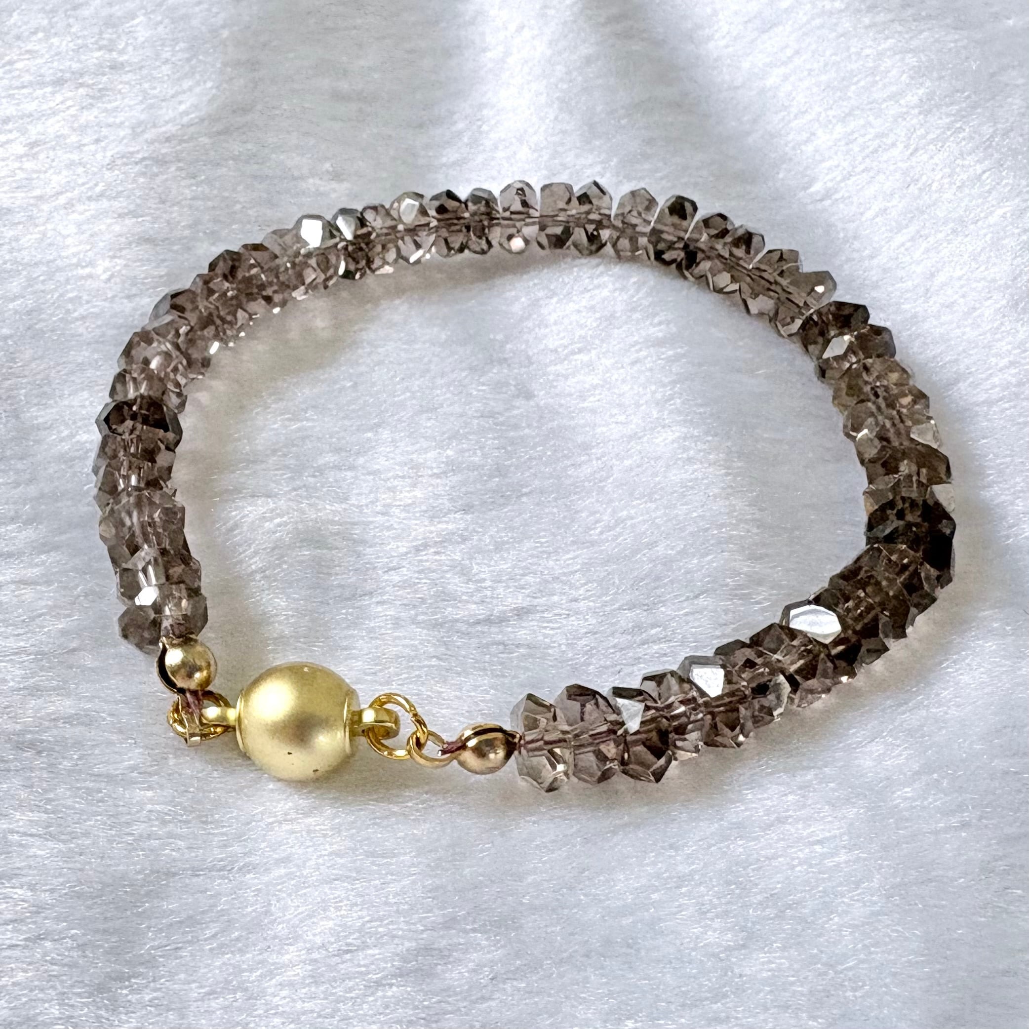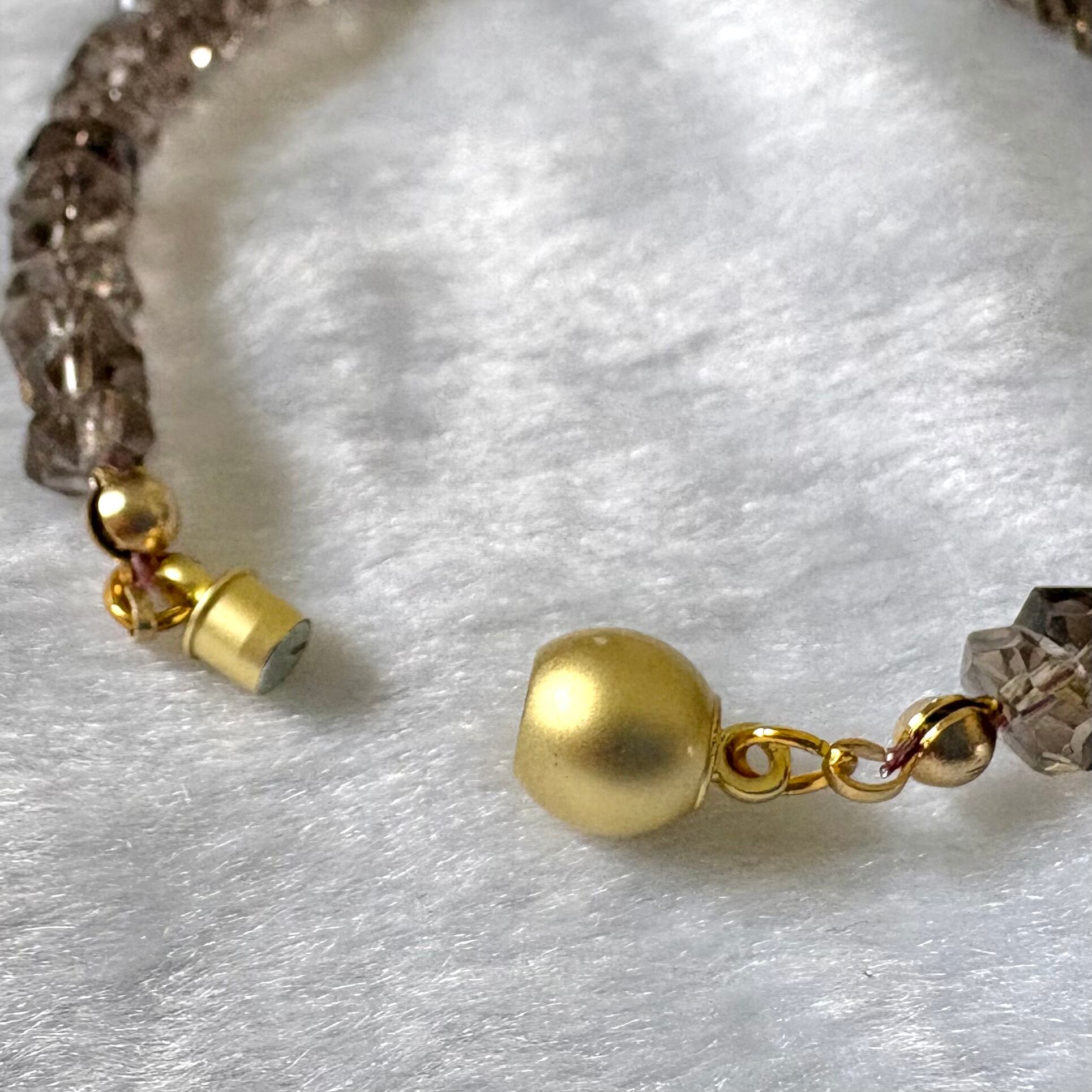 神秘的なブラウンが魅力のスモーキークオーツを使用したブレスレットは、心の安寧や自己受容を促進するアイテムです。どんなスタイルにも馴染むエレガントなデザインで、日常生活に彩りを加えます。