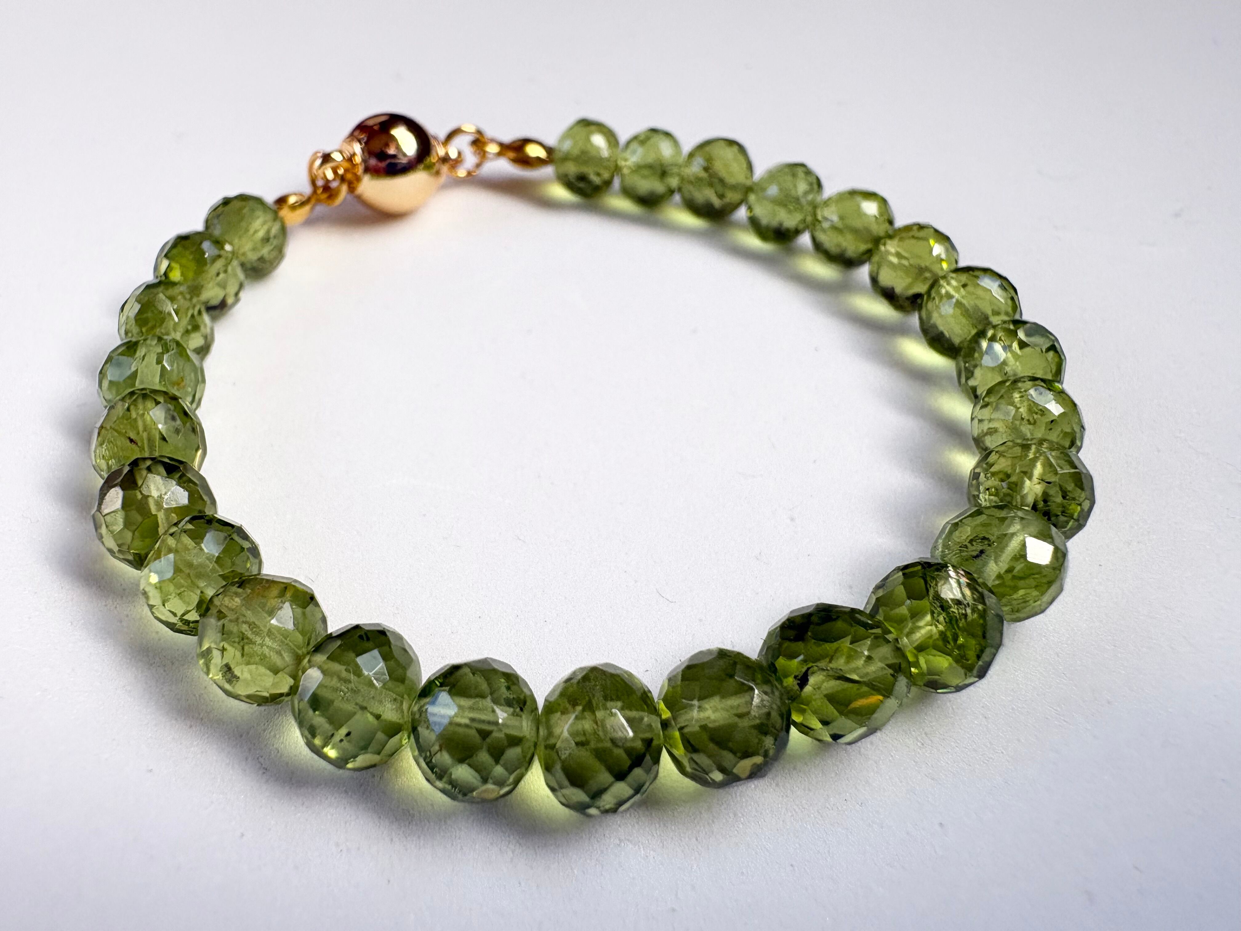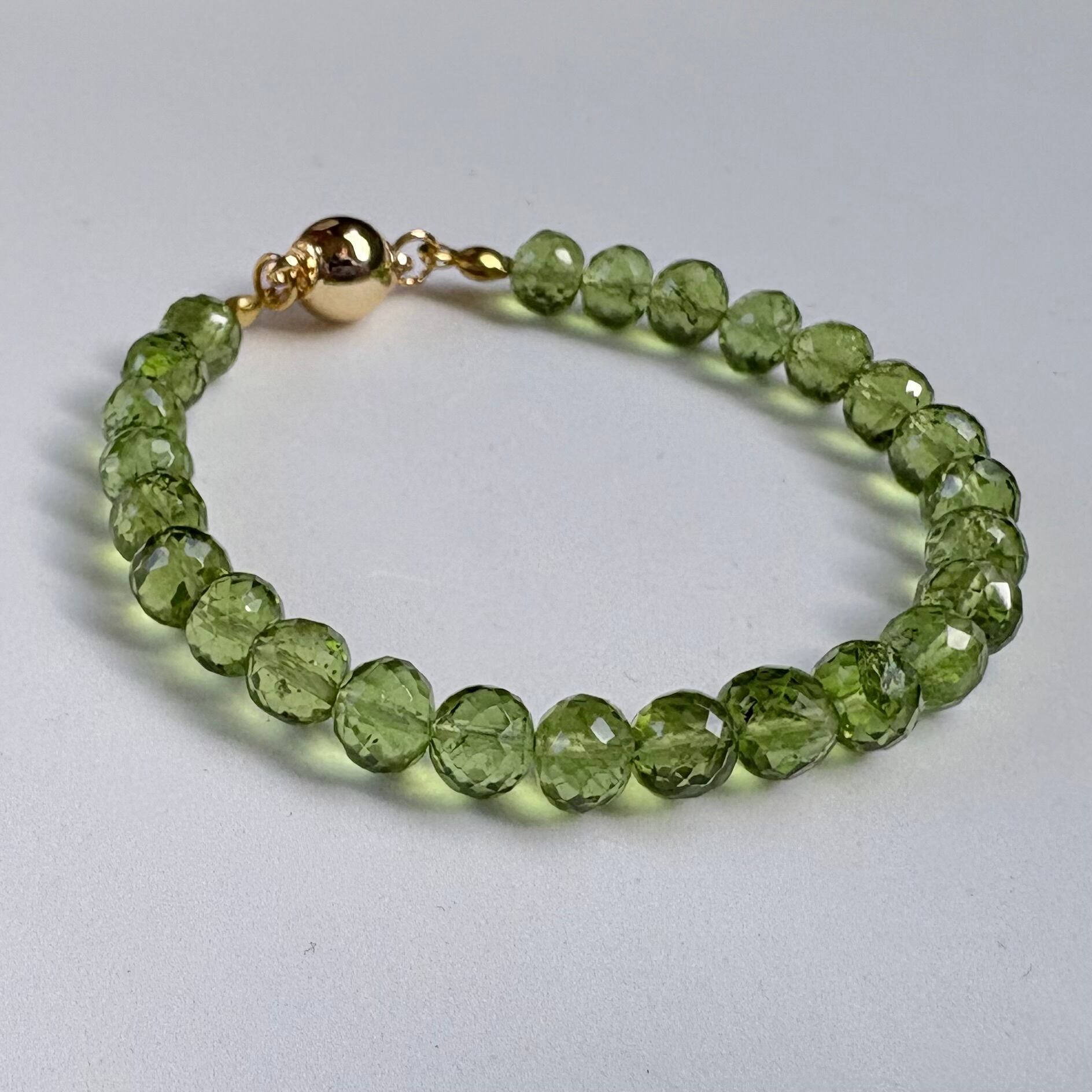 手首周りは約15cm、ペリドットのカットビーズは約8mmのサイズを使用しています。自分へのご褒美や、大切な方へのギフトとしてもぴったりの一品です。