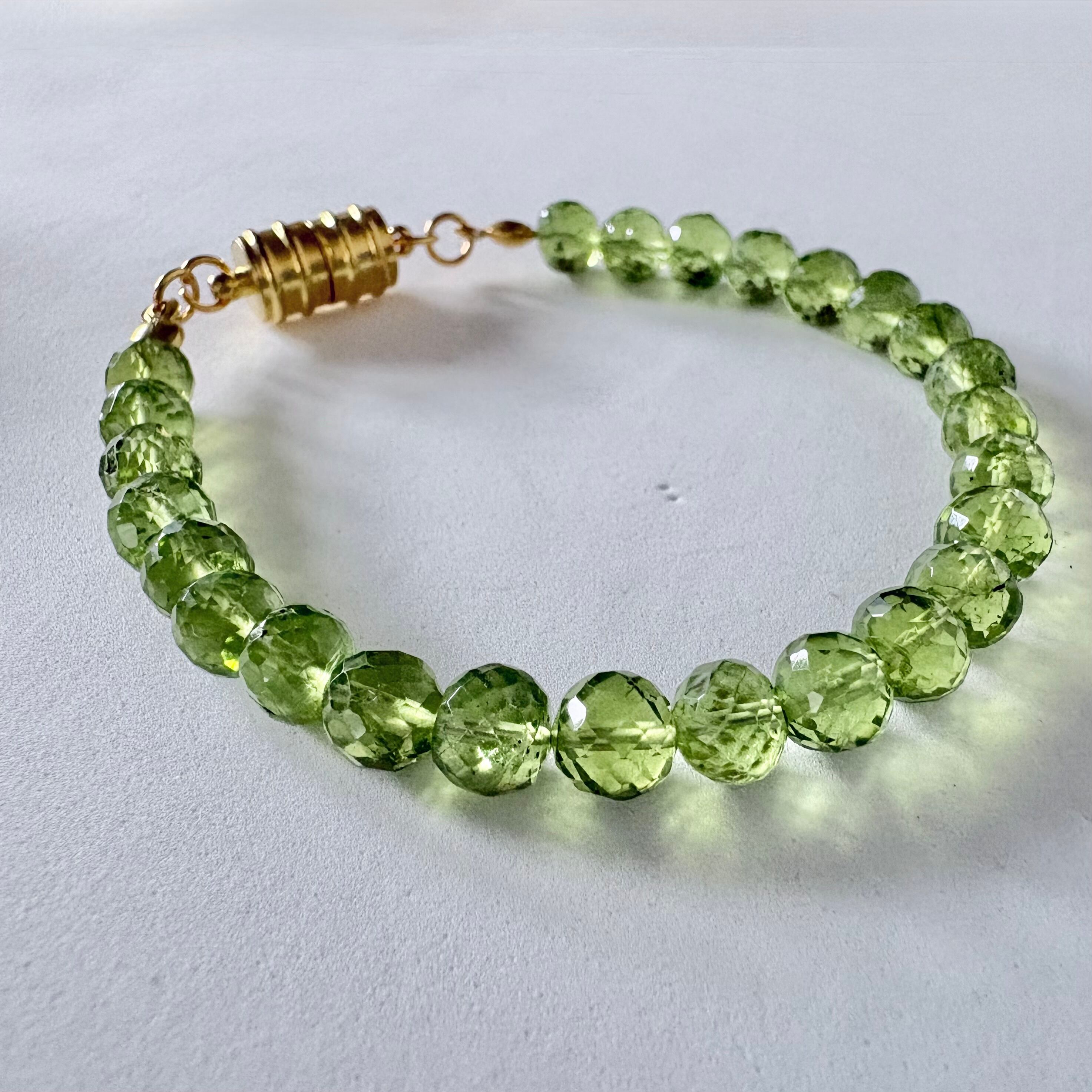 手首周りは約16cm、ペリドットのカットビーズは約8mmのサイズを使用しています。自分へのご褒美や、大切な方へのギフトとしてもぴったりの一品です。