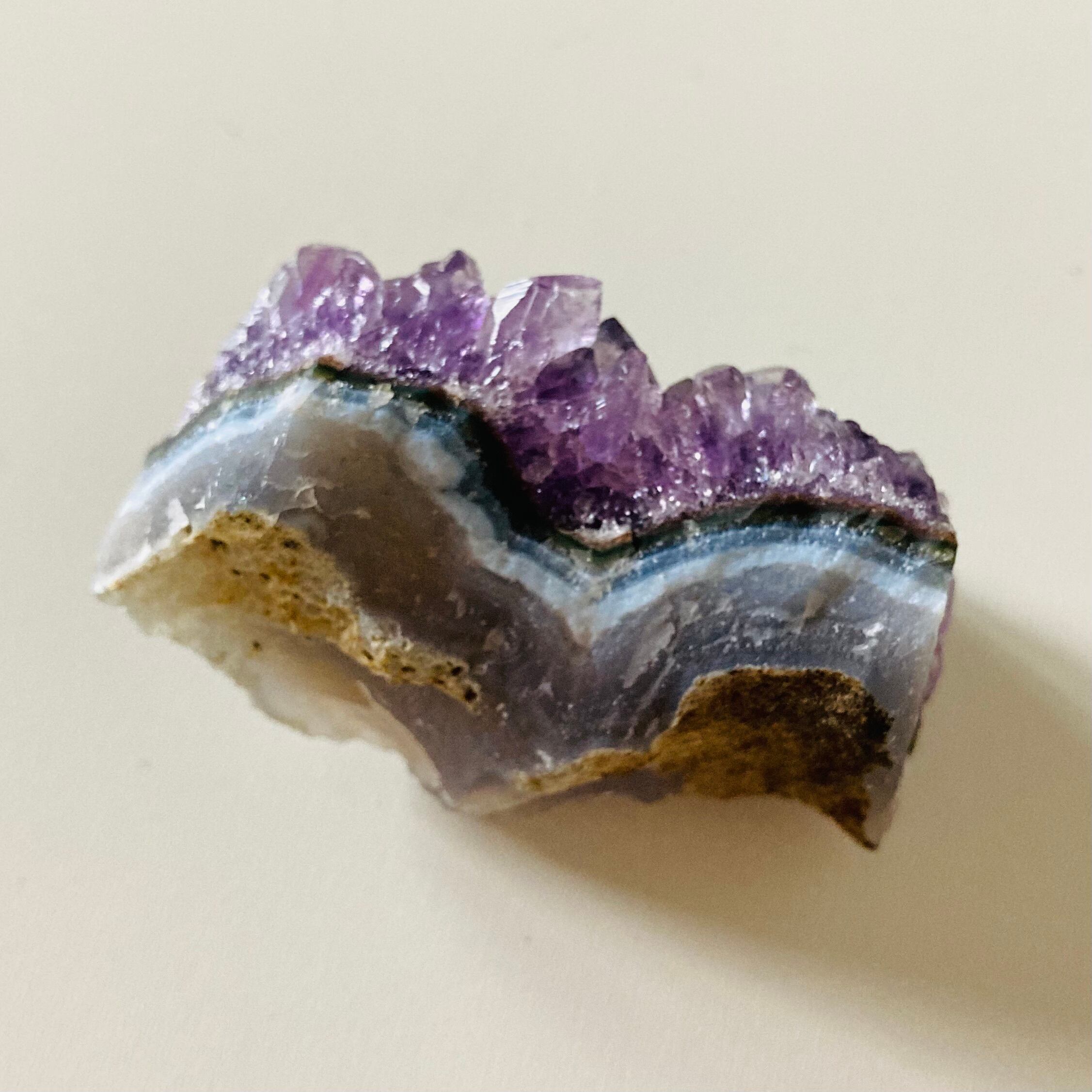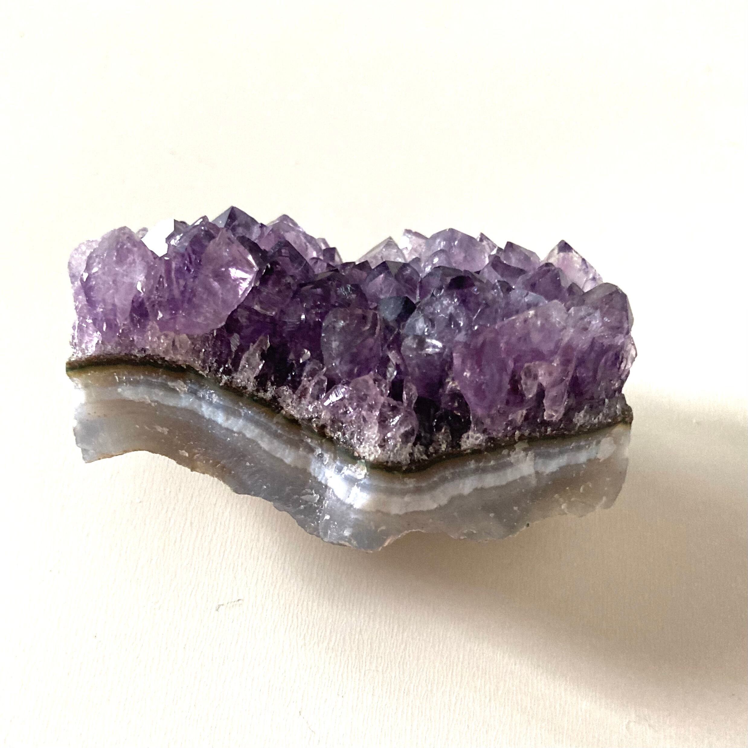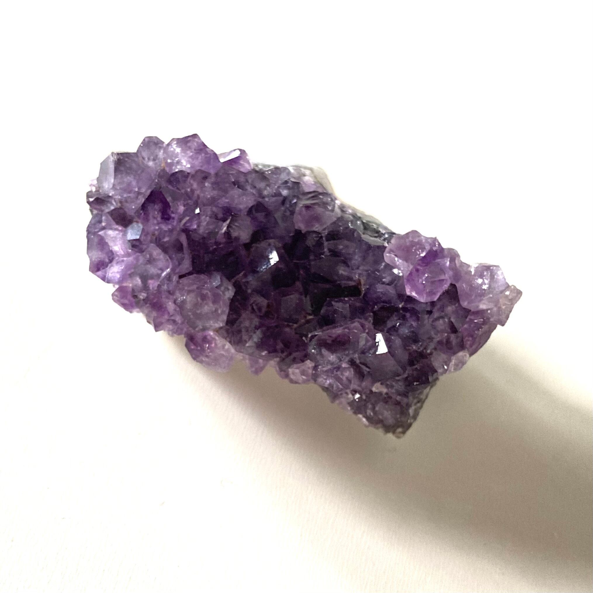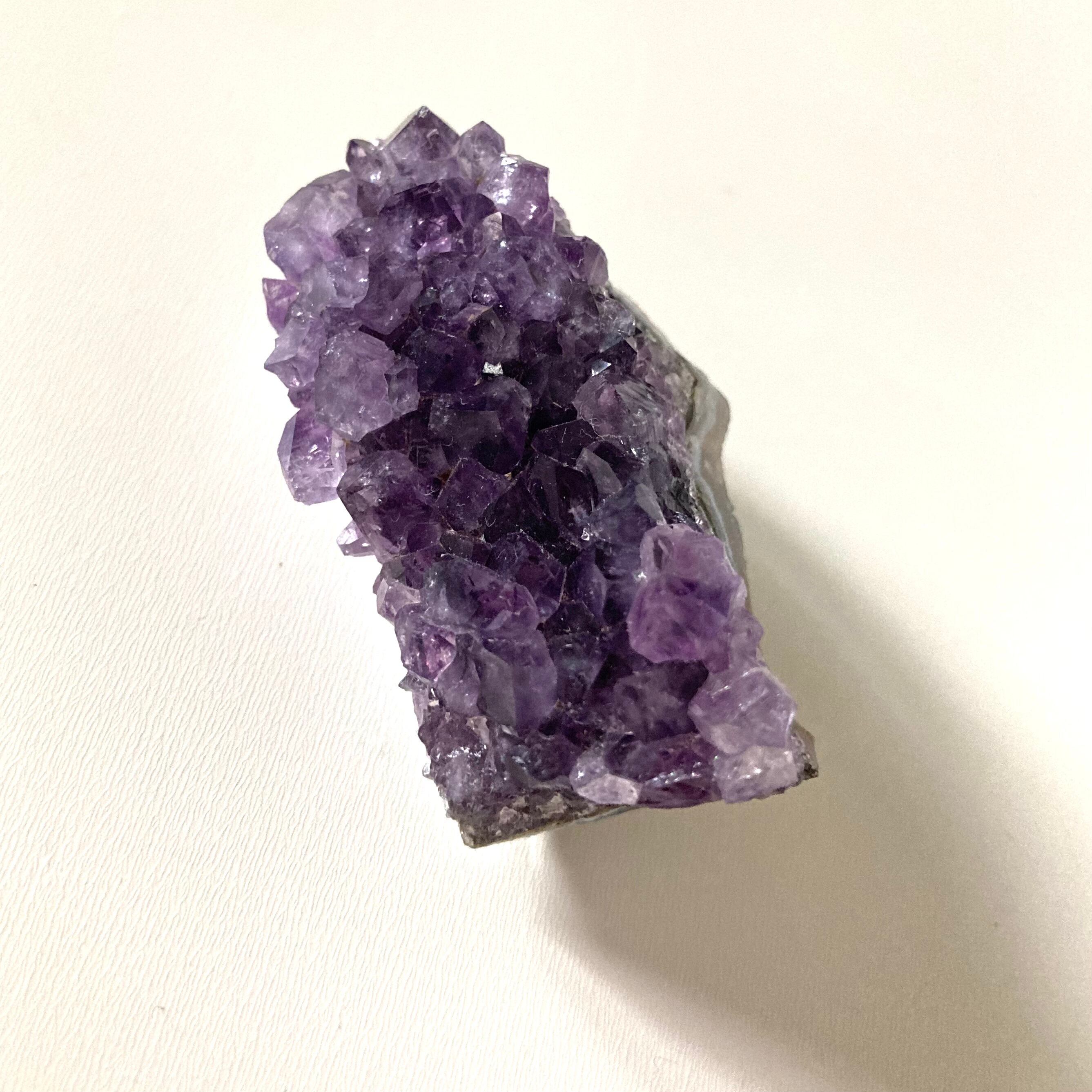 このアメジストクラスターは手のひらサイズで、持ち運びも便利なサイズ感です