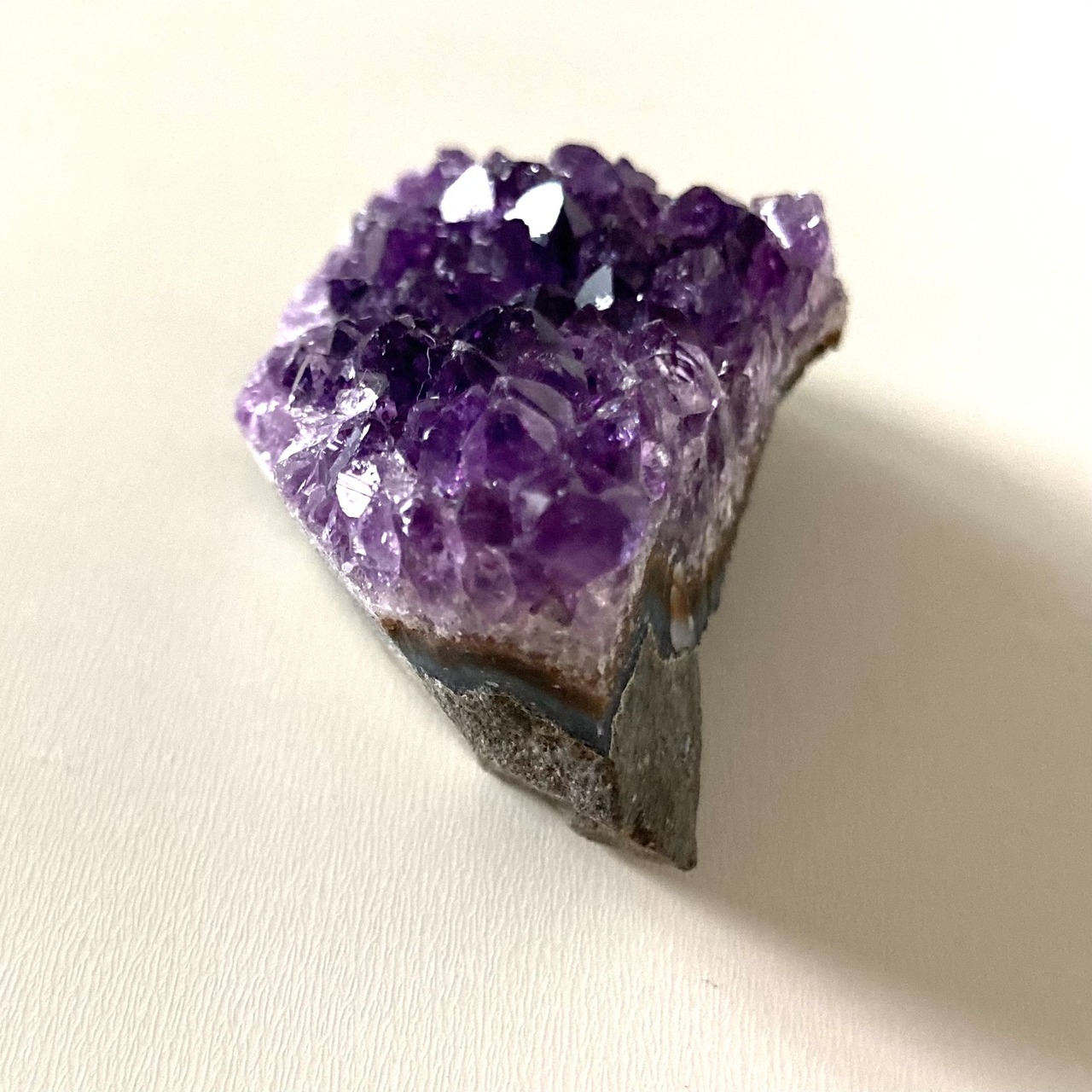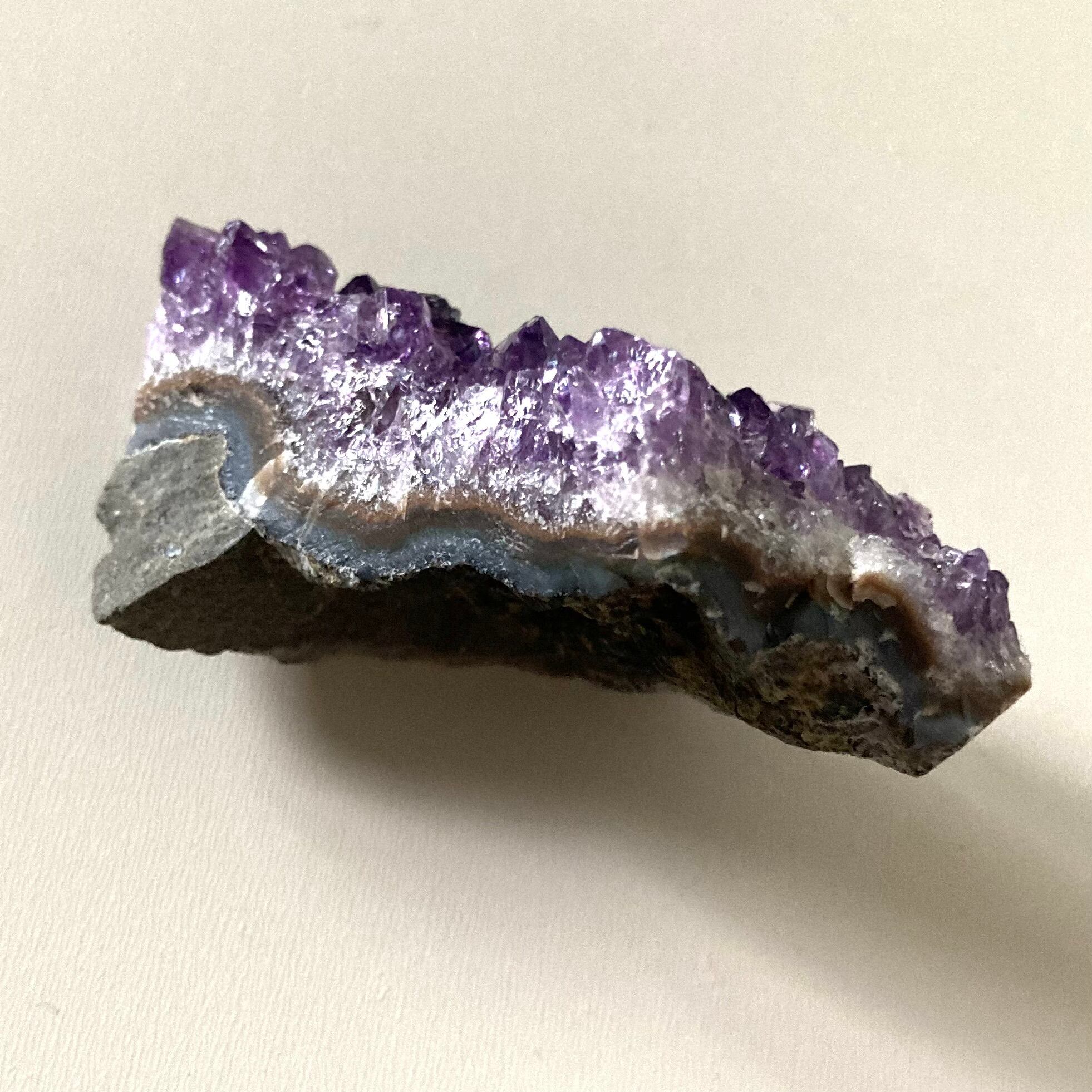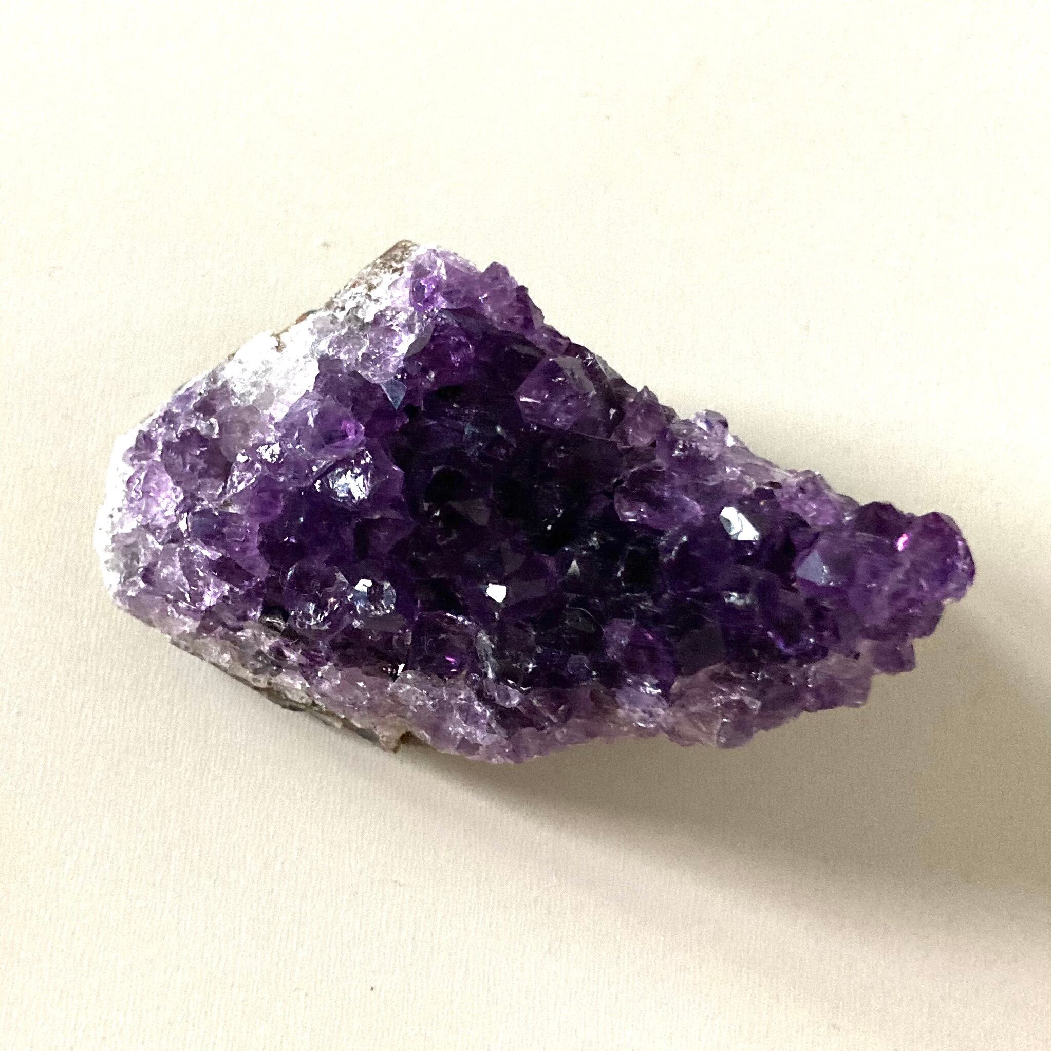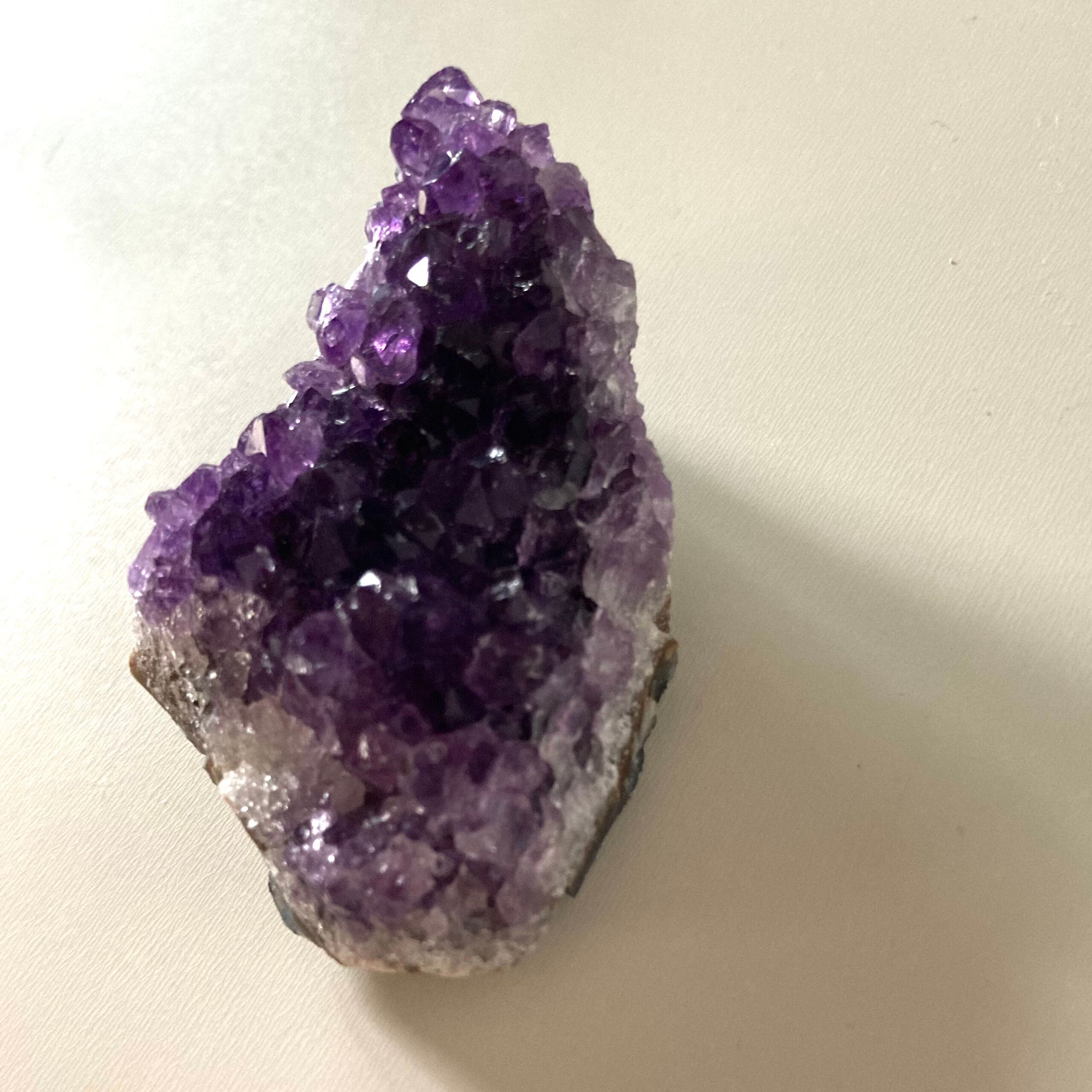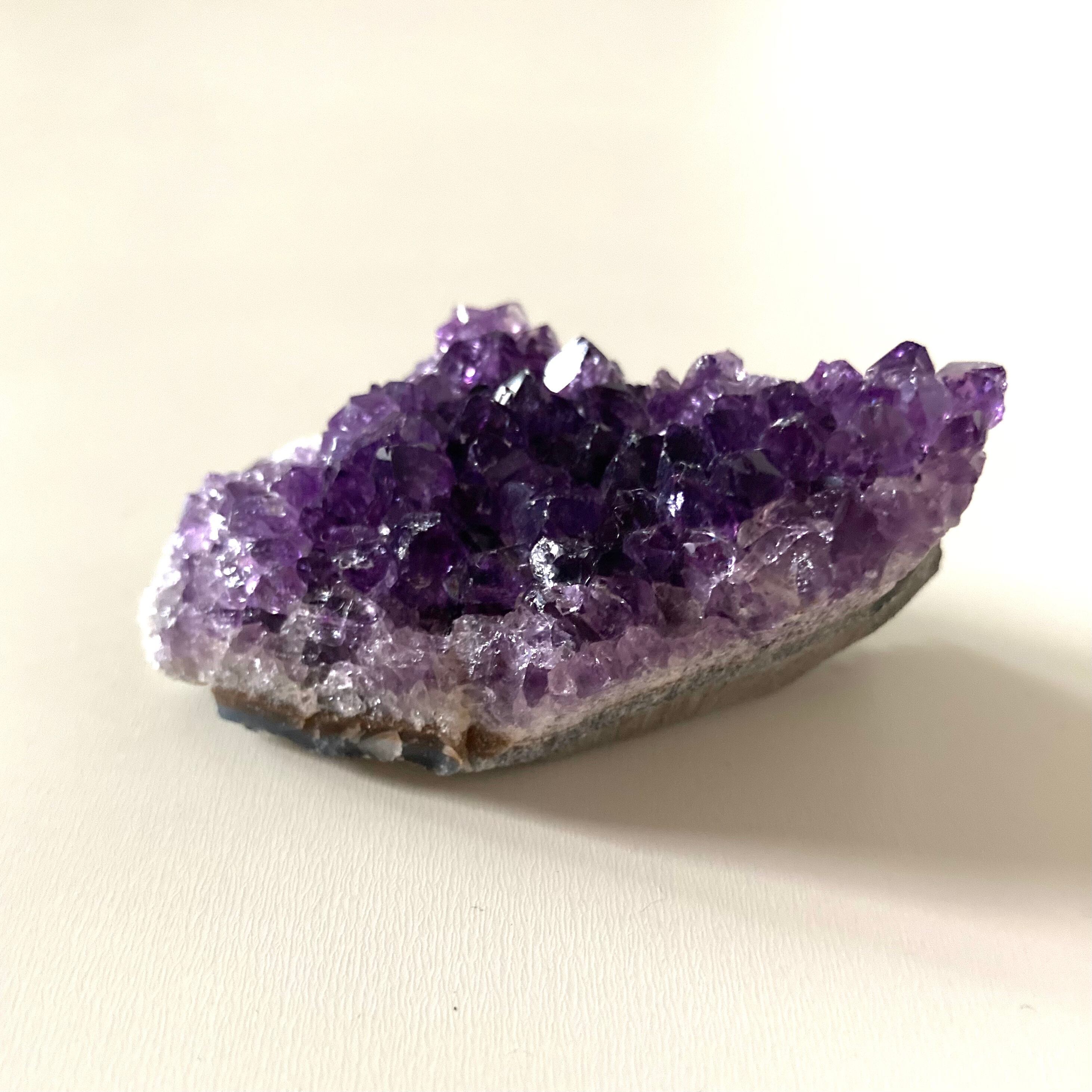 このアメジストクラスターは手のひらサイズで、持ち運びも便利なサイズ感です