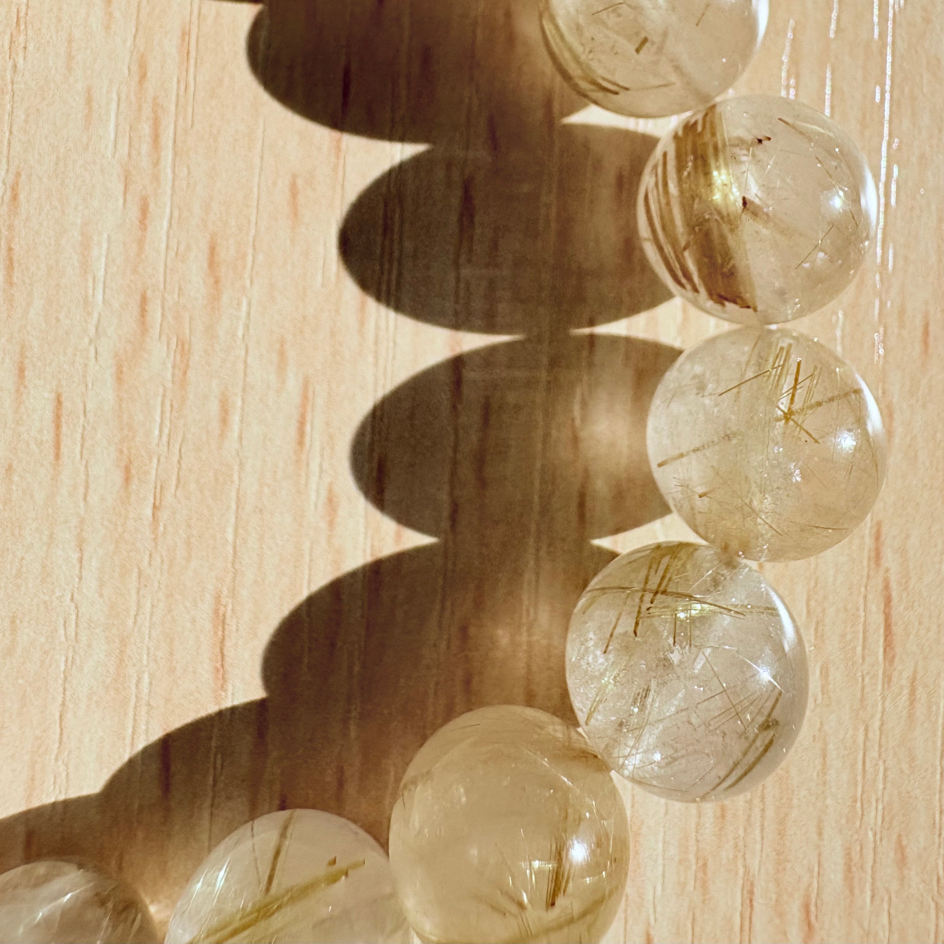 心を癒し、願望を実現する力を秘めたルチルクオーツのブレスレットです。ゴールドのルチル(針)が豊かに内包されており、水晶にやってその輝きが倍増しています